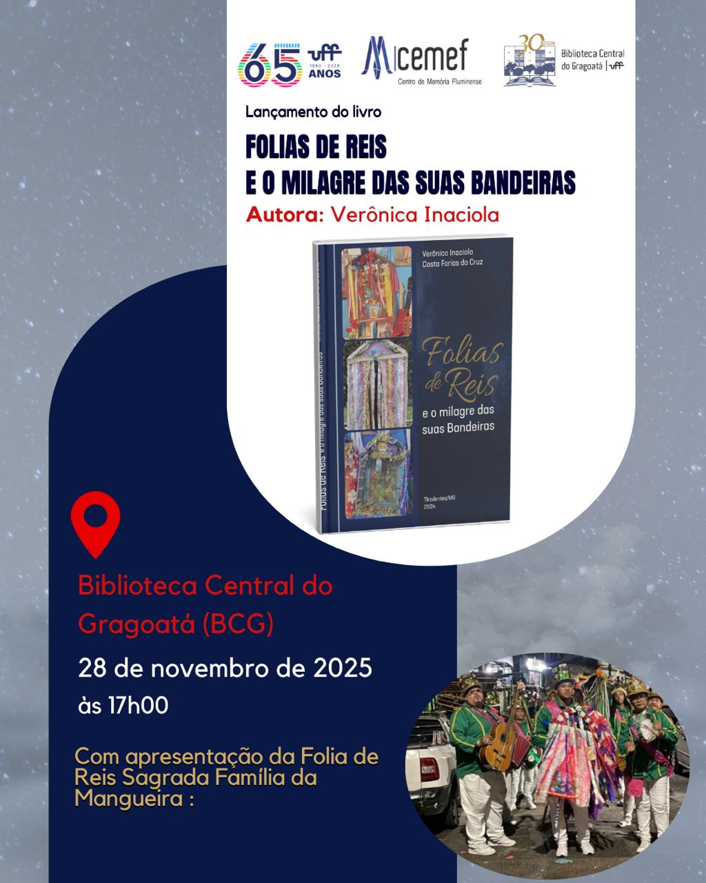 O Centro de Memória Fluminense e a Biblioteca Central do Gragoatá convidam para o lançamento do livro: Folias de reis e o milagre das suas bandeiras da autora Verônica Inaciola. O lançamento acontecerá no primeiro andar da Biblioteca Central do Gragoatá no dia 28 de novembro de 2025 às 17 horas. Com apresentação da Folia de Reis da Sagrada Família da Mangueira, Rio de Janeiro – RJ.
